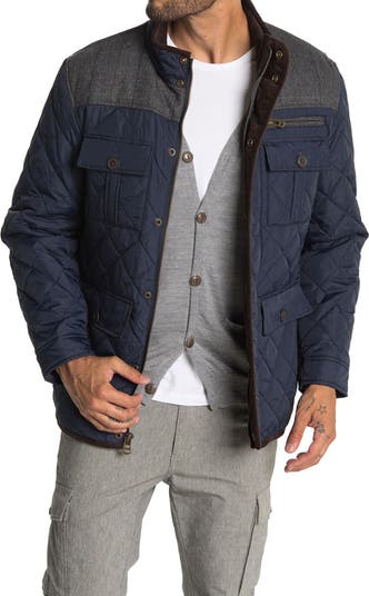 A quilted jacket with a herringbone yoke features multiple utility pockets for functional style.