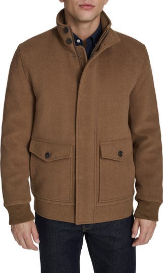 A fitted bomber jacket fashioned from a durable wool blend features a stand collar and a sleek snap storm placket added warmth and comfort.