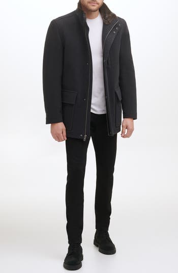 A faux fur lining details the interior of this soft wool blend jacket.