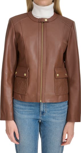 Woven accents and gilded hardware add sleek style points to a buttery leather jacket you'll wear everywhere.