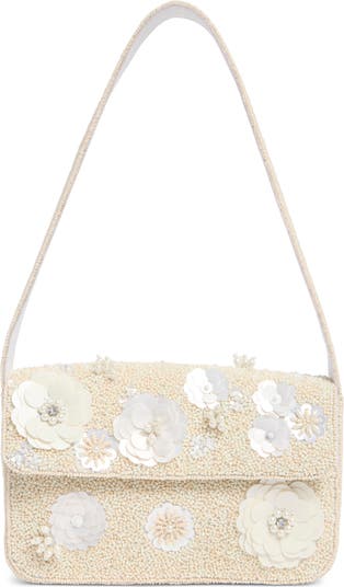 Evoke romantic charm with this intricately beaded shoulder bag showcasing paillette sequin flowers accented by pearly baubles and mini rhinestones.