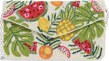 An optional strap lends versatile styling of a summery clutch covered in delicately beaded fronds and juicy pieces of your favorite fruits.