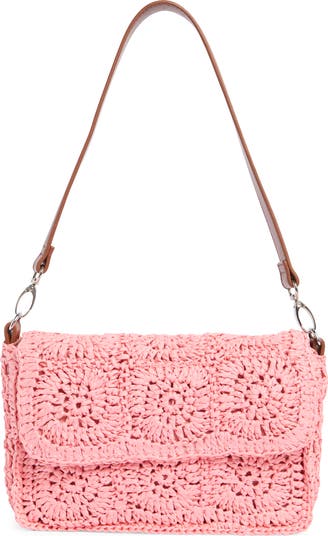 Brighten your day with this lightweight clutch fashioned with pretty crocheted raffia squares and a removable shoulder strap.