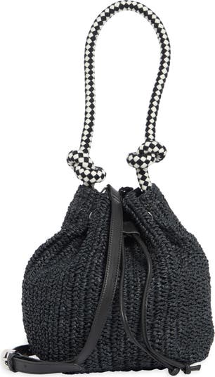 A contrasting black-and-white strap suspends a festival-ready bucket bag that comes with an optional crossbody strap to mix up your carry style with ease.