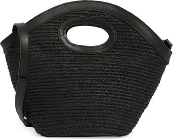 This straw bag with a curved topline and flared silhouette can be carried by hand or crossbody with the optional strap.