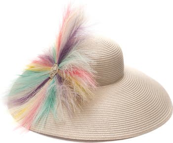 Multicolored feathers lend striking detail to a wide-brim hat that always brings a dose of drama to your special-occasion looks.