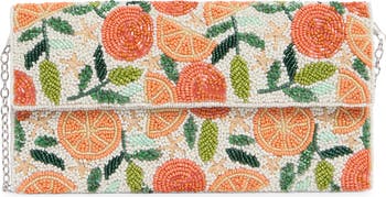 Bring a zesty flair to your casual ensembles with this beaded clutch with orange motifs and finished with an optional chain strap for versatile wear.