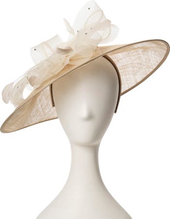 Weddings, garden parties and other special occasions are the perfect setting for this wide-brim fascinator detailed with a large mesh bow embellished by shimmery rhinestones.