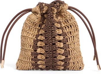 A drawstring bucket silhouette crafted from rustic woven strap showcases the vacation-inspiration behind this compact crossbody bag.