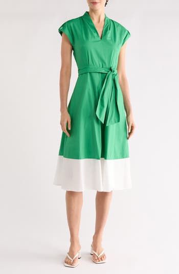 Colorblock Cap Sleeve Cotton Poplin Midi Dress