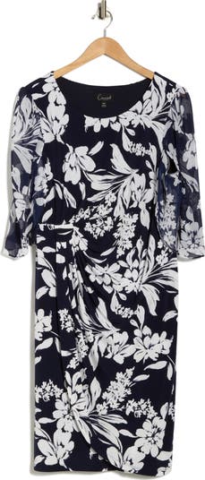 Make an elegant entrance in this faux-wrap dress framed by flowy chiffon cape sleeves and adorned with romantic blooms.