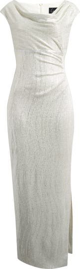 Ruched sides highlight the shimmering texture of an evening-ready dress fashioned with a cowl neck and a side slit that shows a hint of leg.
