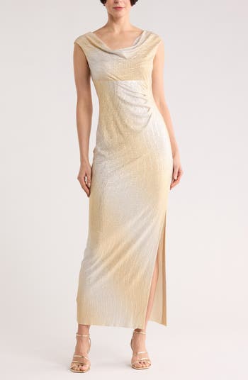 An ombré design covers this foil metallic maxi dress topped with a drapey cowl neckline.