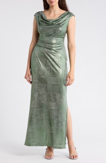 Show off captivating shine in this foiled jersey dress fashioned with a elegantly draped cowl neck and gracefully gathered waist.