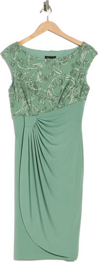 Soutache detailing adds subtle texture and sophistication to a cap-sleeve dress complete with an artfully draped wrap-style skirt.