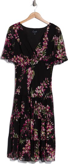 Prepare for party season in this striking midi-length dress featuring a romantic floral print and flutter sleeves for added charm.