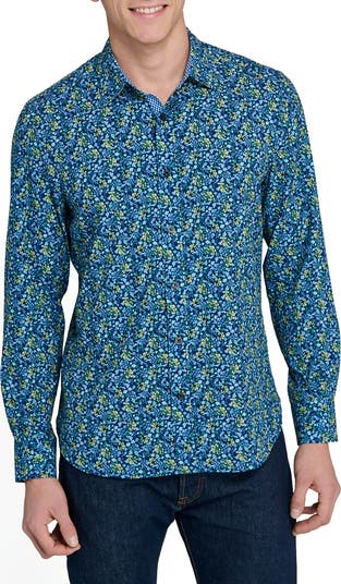 Move with ease from desk duties to happy hour in this effortlessly cool button-up shirt cut from fancy floral fabric with comfortable stretch.