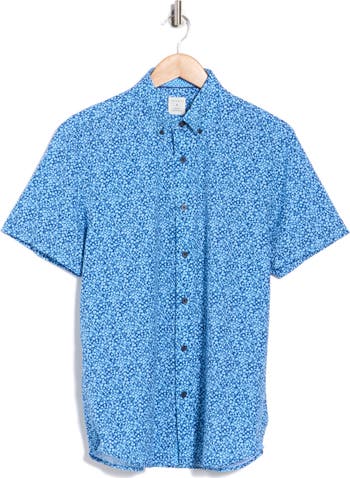 Perfect for warm-weather events or business casual days, this short-sleeved button-down is cut from stretch-enhanced fabric in a floral print.