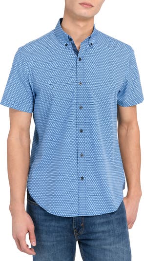 Four-way stretch performance fabric delivers all-day comfort in this woven shirt featuring a button-down collar and boasting a resort-ready print.
