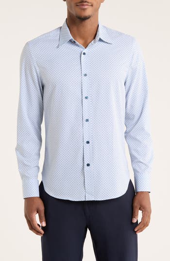 Miniature geometric print boosts the modern style of this slim-fit button-up shirt cut from four-way-stretch performance fabric for superior comfort throughout your day.