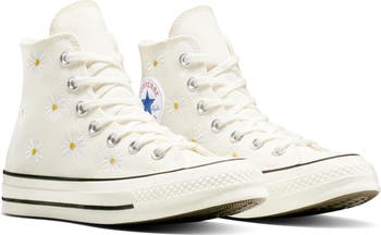 Embroidered flowers boost the retro charm of this canvas high-top sneaker grounded by comfortable cushioning and a grippy rubber sole.