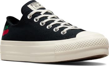 Bright embroidered cherries sweeten the look of this classic canvas sneaker lifted by a thick platform sole.