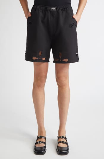 Embroidery-framed petal cutouts bloom in wildflower fashion all around casual shorts topped with a logo-branded elastic waist.
