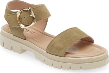 A grippy lug sole adds durability and rugged style to this Italian-crafted sandal secured with an adjustable strap topped with a decorative buckle.