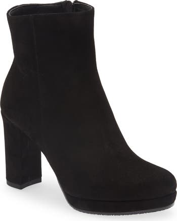 A towering block heel and platform sole elevate an elegant suede bootie featuring a sleek, ankle-skimming silhouette secured by a side-zip closure.