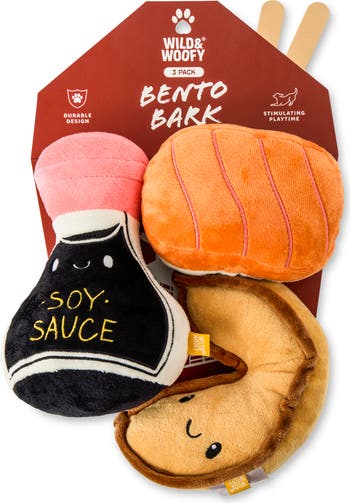 Entertain your furry best friend for hours with this trio of Asian cuisine-inspired plush toys featuring squeakers for added fun.