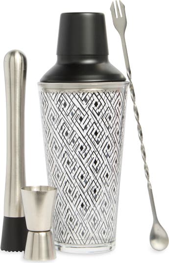 - Includes one shaker, one stirrer spoon, one jigger and one muddler