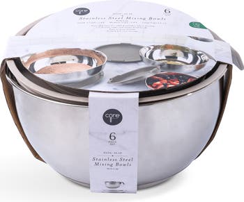 This set of stainless steel mixing bowls features non-slip bases for stability, easy-grip handles and tight-sealing lids to keep food fresh—nesting together for space-saving storage.