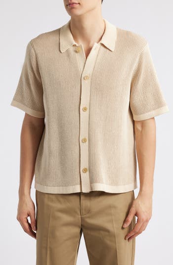 Ribbed stitches texture a short-sleeve cardigan knit in a cool colorblock design from soft cotton yarns.