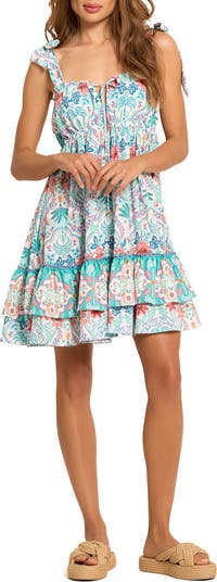 Bead-tipped ties secure the front of this tiered sundress featuring bow-detailed shoulders and a smocked back panel.
