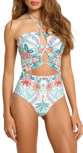 Head to the beach or pool in this vibrant one-piece swimsuit fashioned with alluring front cutouts and adjustable halter ties.