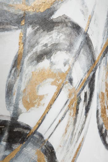 - - Abstract contemporary art painting - Water color and acrylic paint over a fabric canvas housed in a textured, metallic gold Chinese fir wood frame with a matte black frame between the two - Large sweeping brushstrokes in a lively abstract design gallop about the canvas in diluted gray and black colors layered beneath opaque, metallic gold brushstrokes over a white background - This canvas painting is easy to hang by the sawtooth metal hardware at the top back of the frame - Color: white/gold - 29" x 1" x 39" - Imported