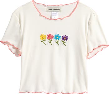 Level up your child's T-shirt collection with this pretty ribbed iteration that's embroidered with colorful daisies and finished with lettuce edging.