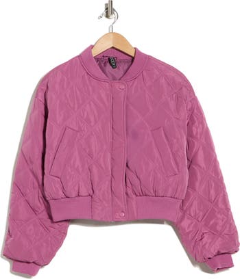 Stay warm in this cozy quilted bomber jacket fashioned in a slouchy, cropped silhouette for sporty style.