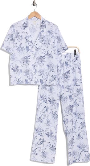Blossoming flowers bring a sweet detail to matching pajamas that pair a buttoned shirt with full-length pants and feature pure-cotton fabrication for lasting comfort.