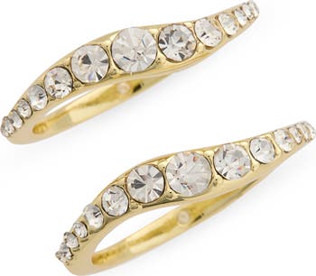 Cubic zirconia stones sparkle and shine on top of a pair of stackable wavy rings finished in radiant goldtone shine.
