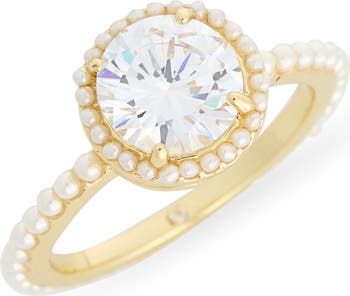 A round-cut cubic zirconia stone offers brilliant shine to promise ring halo set with lustrous faux pearls.