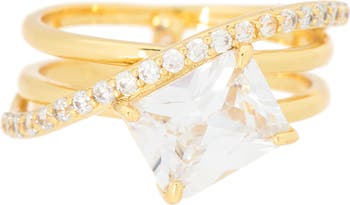 Split shanks create a layered look on a 14-karat gold-plated ring accented with cubic zirconia for added shine.