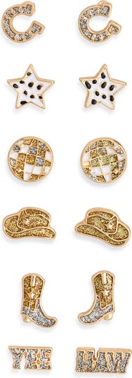 Bring Western-inspired flair to your ensembles with this cowboy-themed set of assorted stud earrings filled in with sparkly centers.