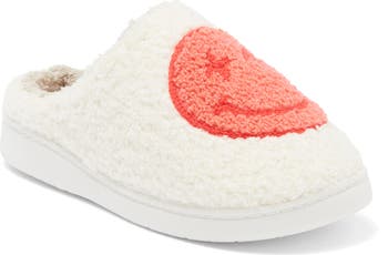 High-pile fleece furthers the comfort of a slipper lofted by a chunky platform and finished with a cute graphic.