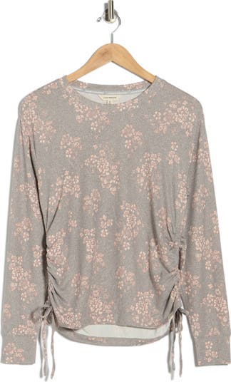 A charming floral print adorns this soft, cozy long-sleeve top framed by ruched sides with cinching drawstring ties.