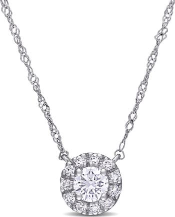 Round lab-grown diamonds bring luxurious sparkle to this dainty halo pendant necklace crafted from polished 14-karat white gold.