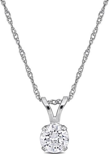 A prong-set round lab-grown diamond brings luxurious sparkle to this elegant pendant necklace crafted from polished 14-karat white gold.