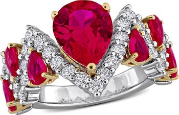 Prong-set pear lab-grown rubies illuminated by round lab-grown diamonds detail this polished sterling silver ring for luxurious sparkle.