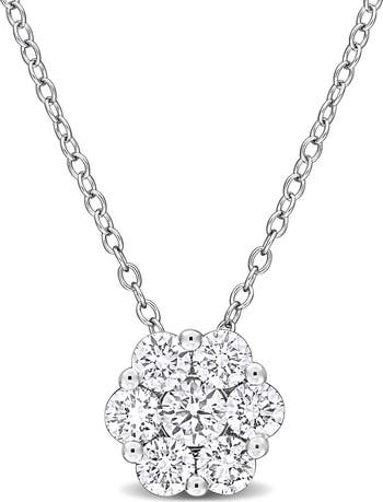 Round lab-grown diamonds bring luxurious sparkle to this dainty cluster pendant necklace crafted from polished sterling silver.