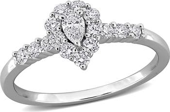 Pear- and round-cut lab-grown diamonds bring luxurious sparkle to this elegant halo ring crafted from polished sterling silver.